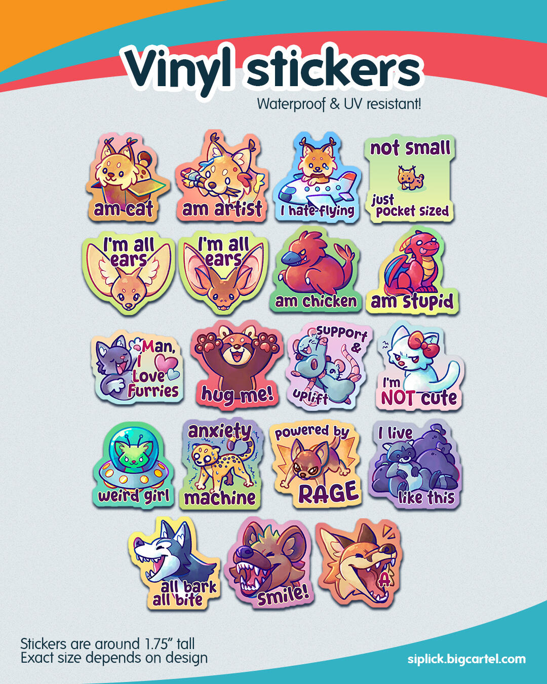 ¡Estos son mis diseños de pegatinas disponibles hasta la fecha!Todas mis pegatinas están hechas en vinilo y son resistentes al agua y a la luz del sol.